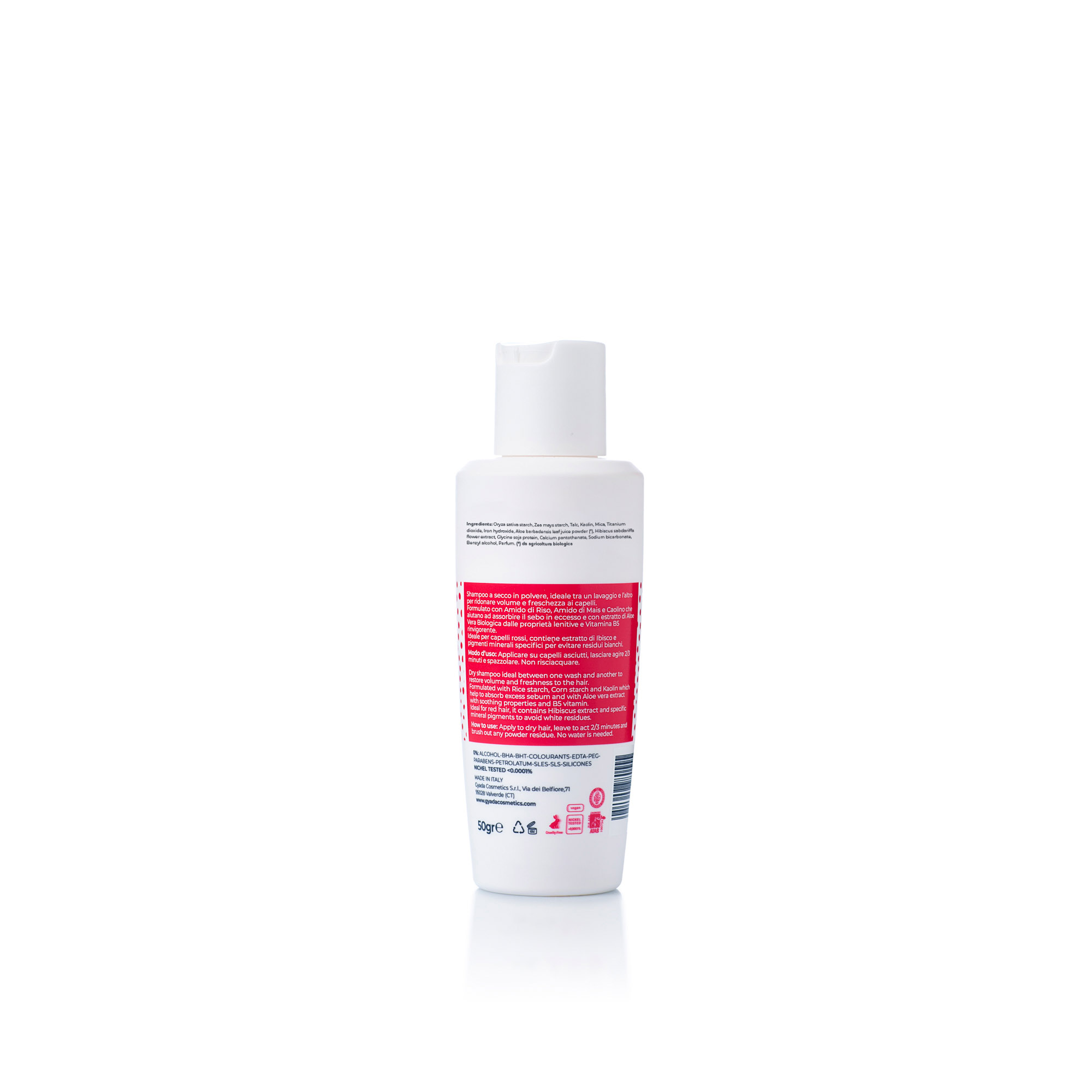 Formulato con Amido di Riso, Amido di Mais e Caolino che aiutano ad assorbire il sebo in eccesso e con estratto di Aloe Vera Biologica dalle proprietà lenitive e Vitamina B5 rinvigorente.