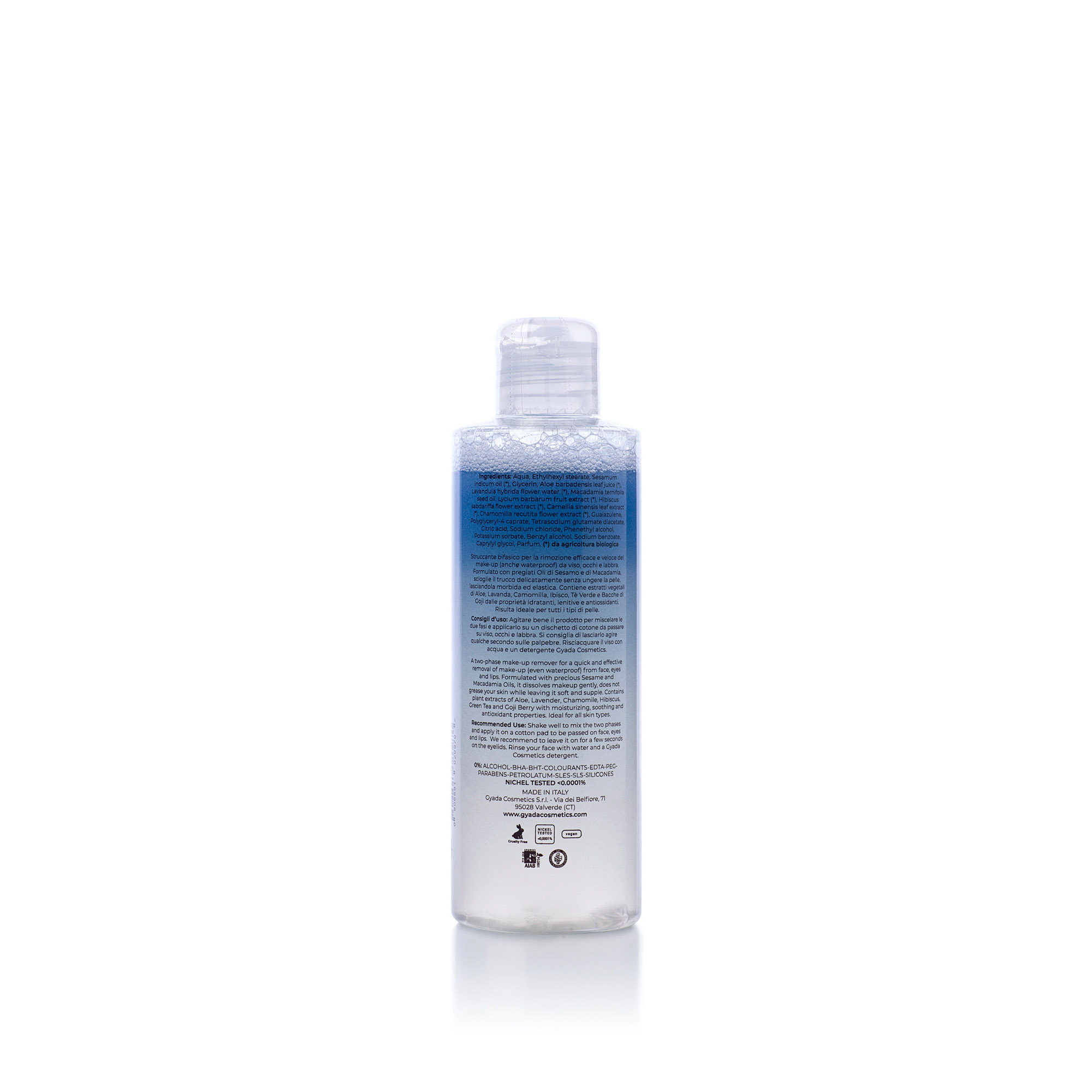 Consigli d’Uso: agitare bene il prodotto per miscelare le due fasi e applicarlo su un dischetto di cotone da passare su viso, occhi e labbra. Si consiglia di lasciarlo agire qualche secondo sulle palpebre. Risciacquare il viso con acqua e un detergente Gyada Cosmetics.